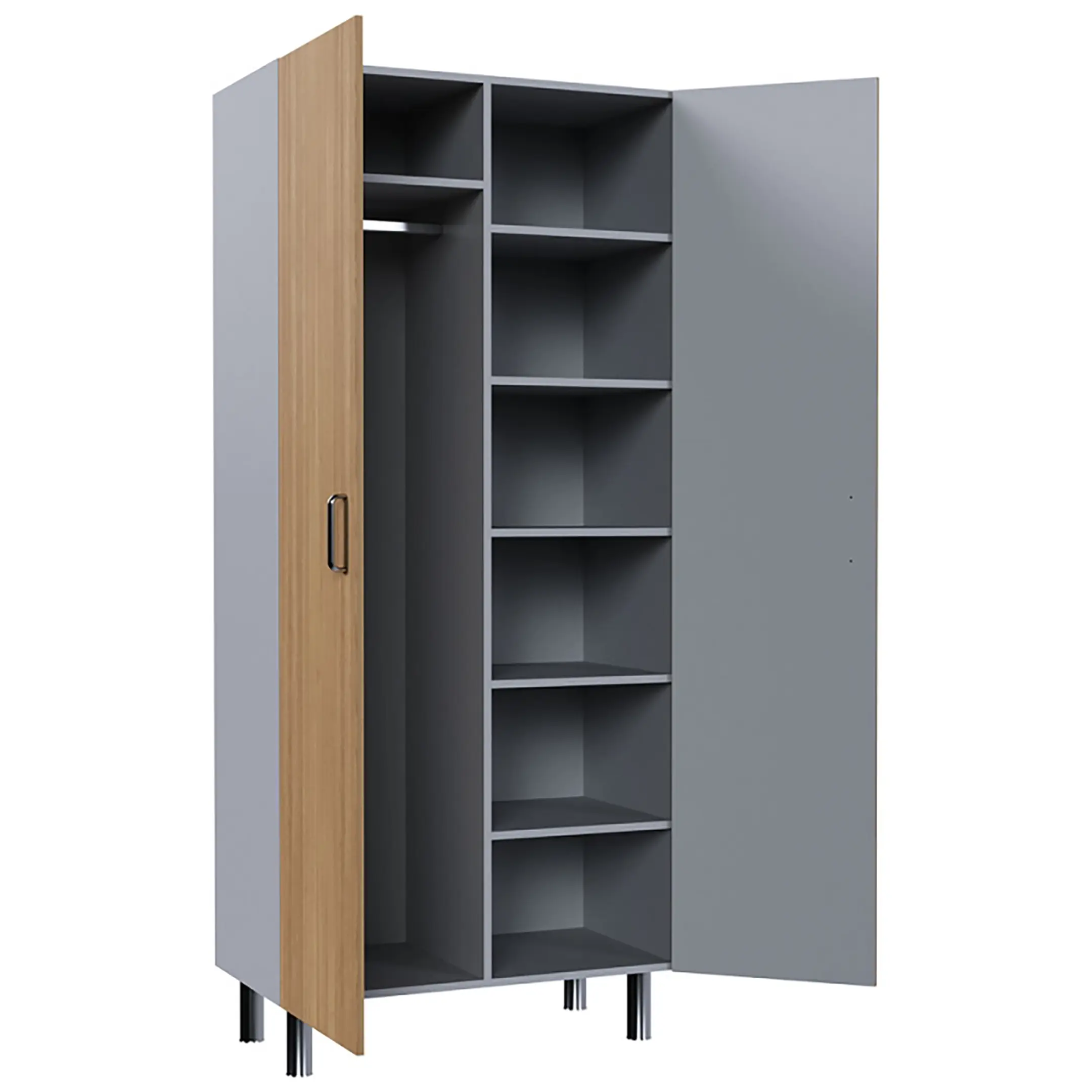 • имеет одно отделение с полкой для головных уборов и перекладина для вешалок, и второе отделение с шестью полками;