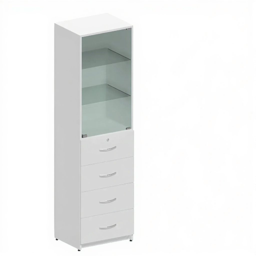 • Нижняя секция состоит из 4 ящиков (ЛДСП), один из которых оснащен мебельным замком;