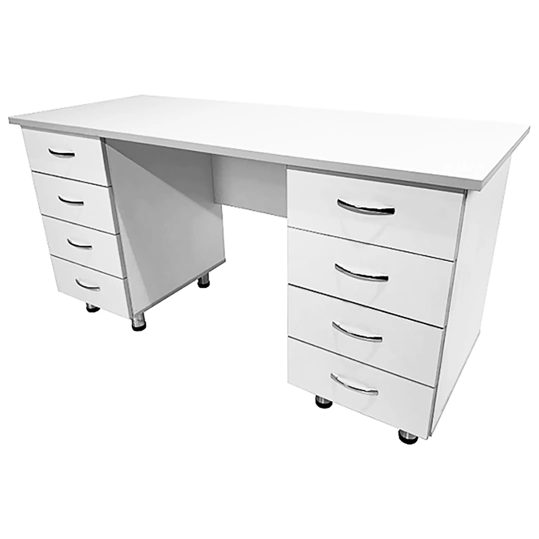 Ключевая особенность данной модели - наличие двух боковых тумб, каждая из которых оснащена четырьмя выдвижными ящиками. Это предоставляет удобное и организованное хранение документов, инструментов и других необходимых материалов. Сочетание белого цвета ЛДСП с светло-серой кромкой создает стильный и современный внешний вид стола.