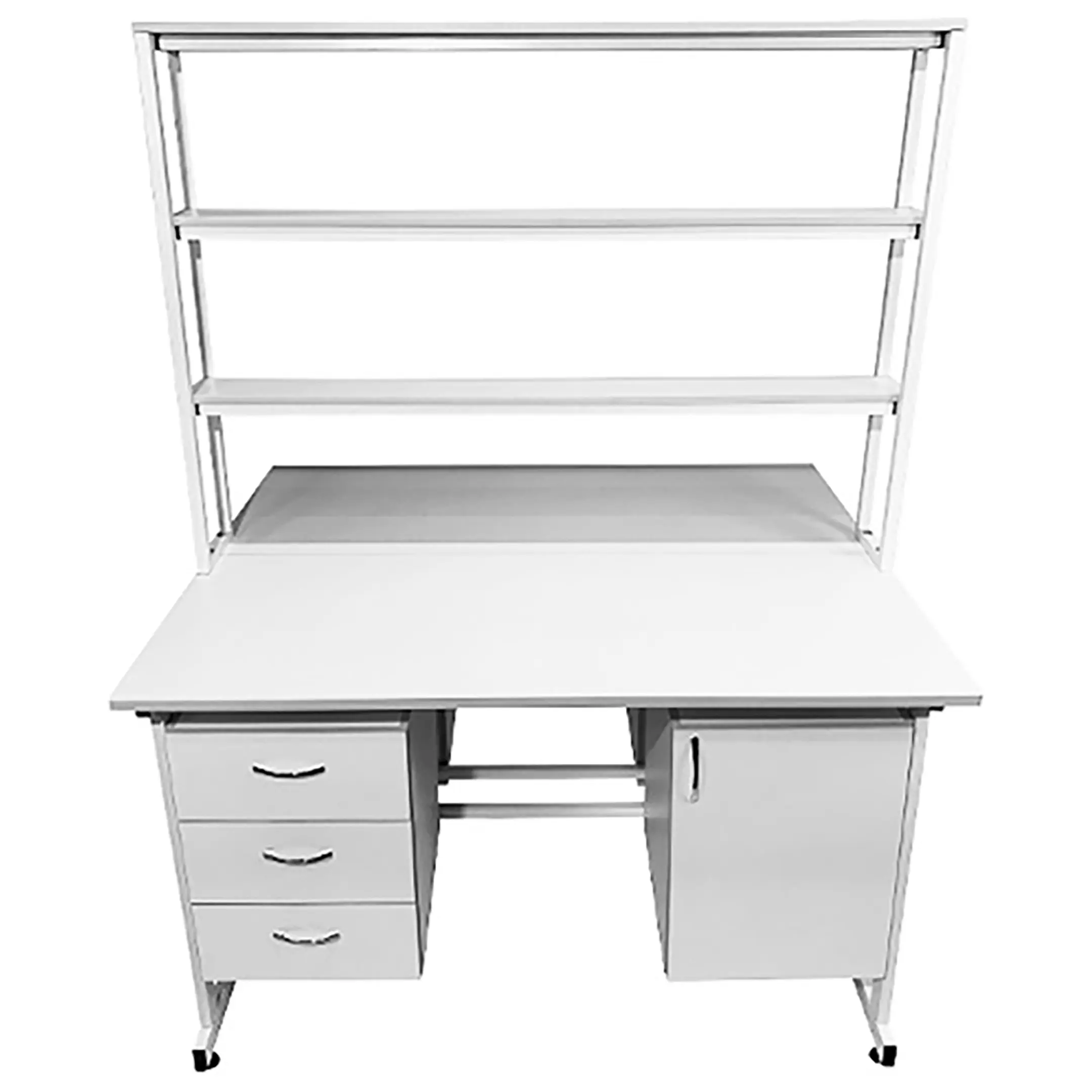 Стол лабораторный островной с надстройкой Сло 22.024 (белый) — это универсальное и практичное решение для организации рабочих мест в медицинских учреждениях и научных лабораториях. Модель обеспечивает возможность разместить два полнофункциональных рабочих места, помогая оптимально использовать доступное пространство. Каждое рабочее место оснащено двумя подвесными тумбами с ящиками и полками, а центральная надстройка имеет три полки. Каркас выполнен из стального профиля, столешницы из ЛДСП толщиной 22 мм.