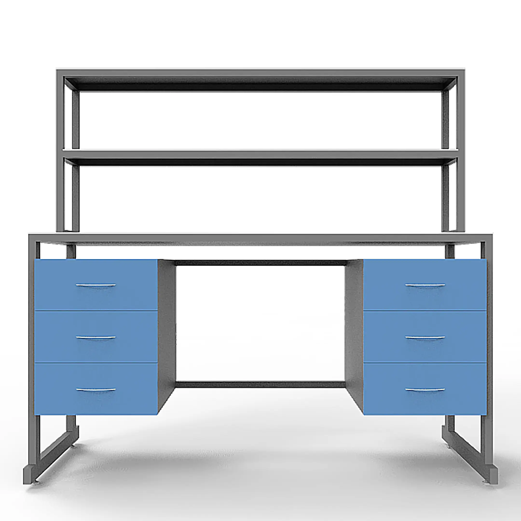 - Вместительная система хранения — две тумбы под столешницей, каждая с тремя выдвижными ящиками (всего 6 ящиков), и надстройка с двумя полками.