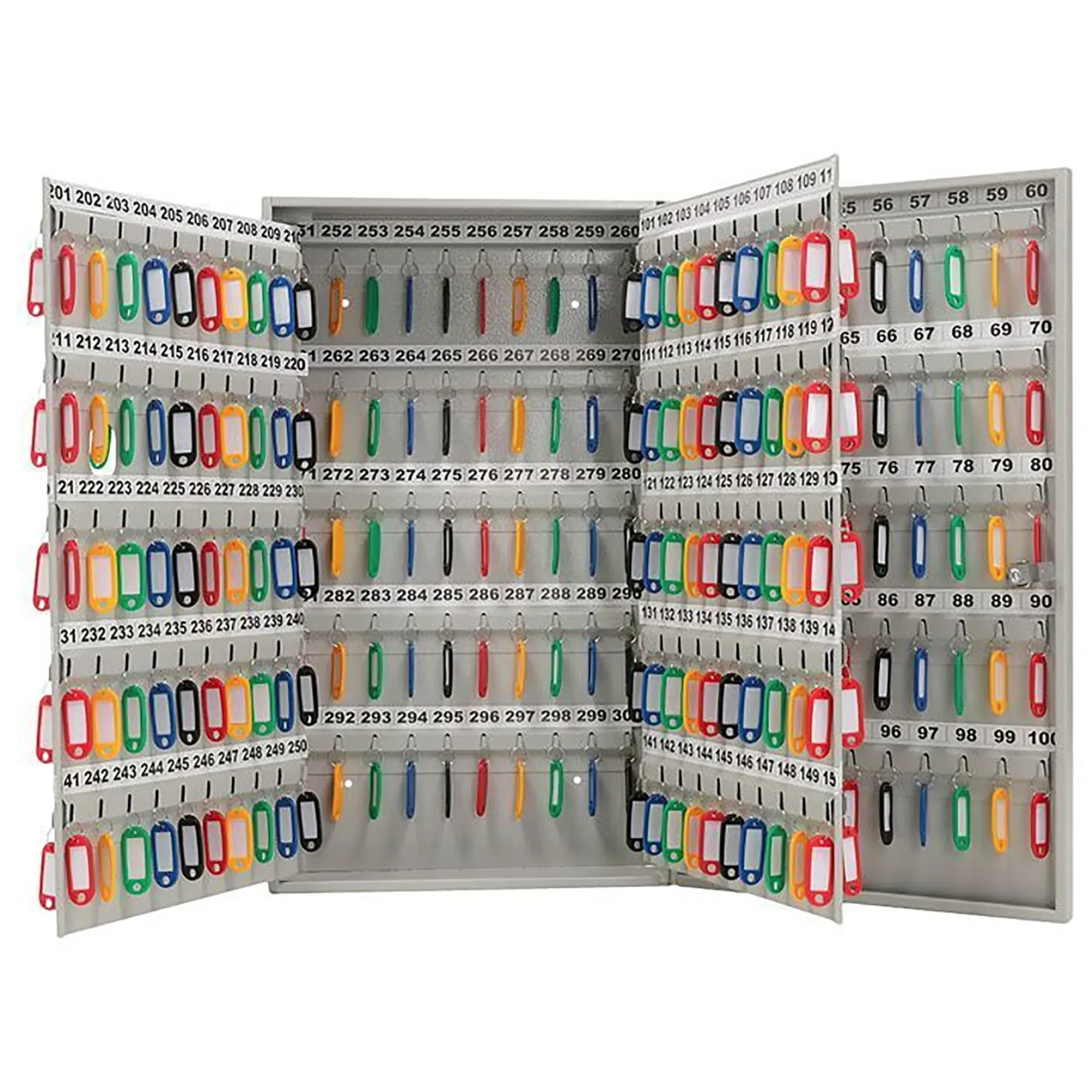 - Четкая система учета и мгновенный поиск — продуманная нумерация трехсот ячеек и комплект соответствующих брелков позволяют вести детальный журнал, присваивать уникальные номера каждому ключу и контролировать их движение. Персонал службы безопасности или администрации находит нужный ключ за считанные секунды.