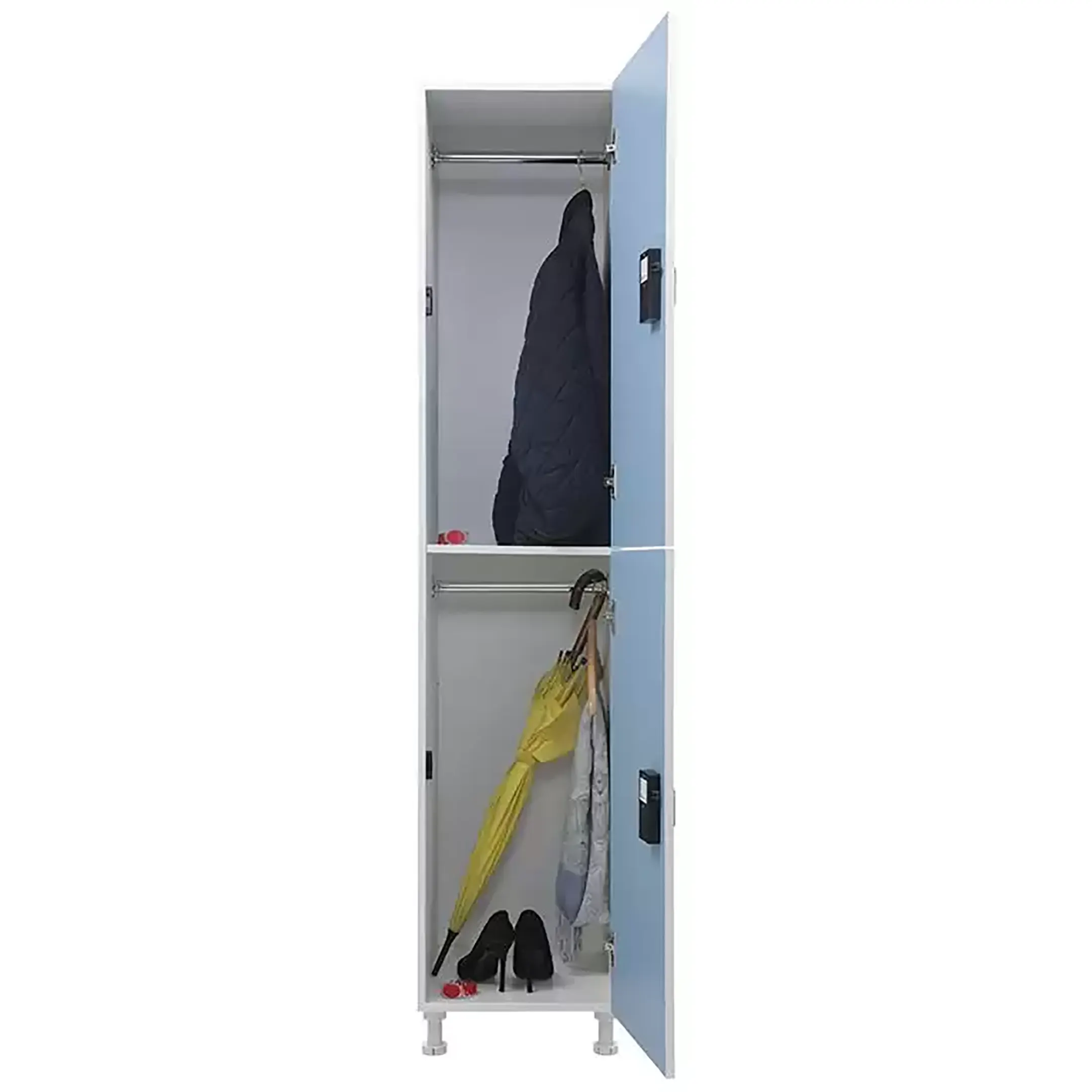 Шкаф для раздевалок WL 12-40 EL голубой/белый — это современное и функциональное решение для хранения одежды в спортивных, производственных, образовательных и других помещениях. Модель изготовлена из высококачественных материалов с применением современных технологий, оснащена электронным замком, выполняющим роль ручки для открывания двери.