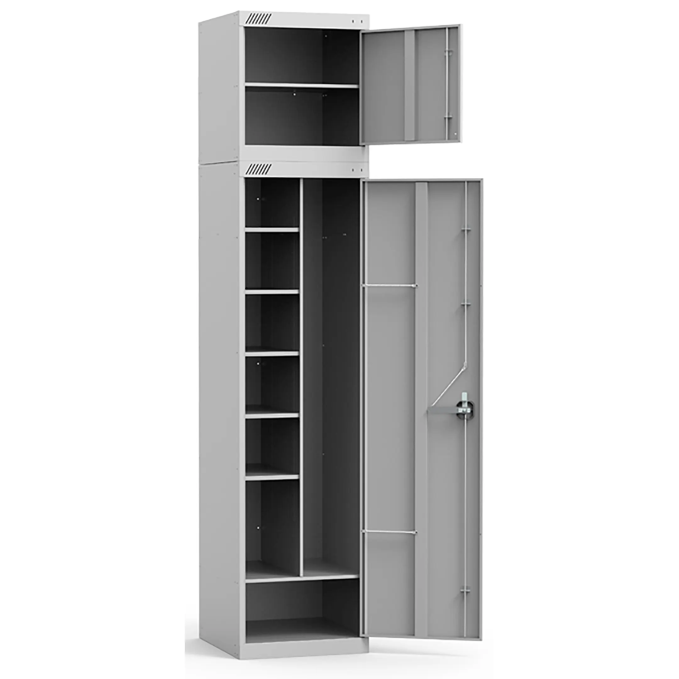 Шкаф универсальный с антресолью — это практичное и вместительное решение для организации хранения в различных помещениях. Модель с дополнительной верхней полкой позволяет рационально использовать пространство по высоте и идеально подходит для гардеробных, раздевалок, учебных заведений и офисов.