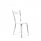 Воздушная модель стула имеет интересный дизайн спинки, представляющую собой крестообразное пресечение нескольких металлических нитей, образующих в центре маленькие ромбики. Каркас стула выполнен из хромированного металла
