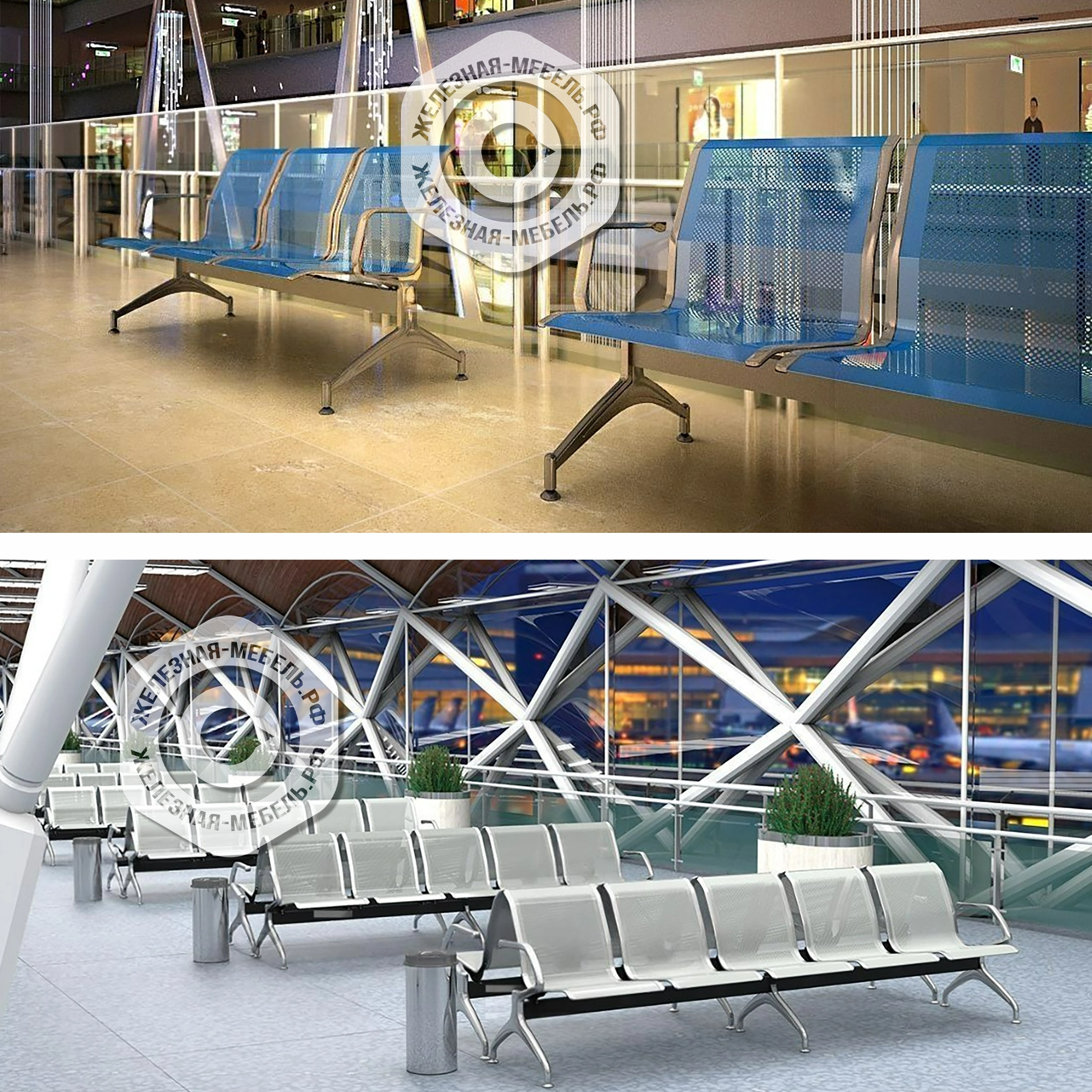 Стоимость указана за модель с покрытием металлокаркаса: балка - RAL 9005 "черный муар", перфорация - RAL 7001 "серый" и с хромированными элементами (подлокотники, опоры и окантовка сидений). Все варианты окрашивания металлических каркасов на последних фото.