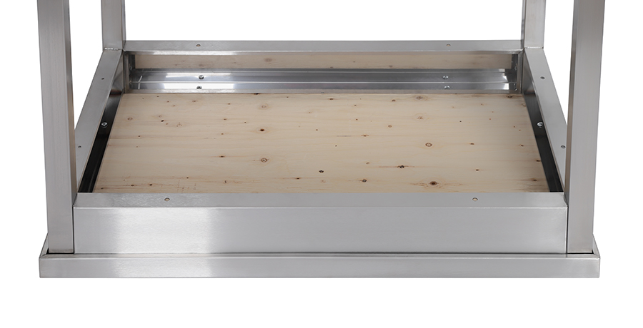 На нижней сплошной полке, которая изготовлена из нержавейки, хранят наплитную посуду, гастроемкости, миски, ведра или баки.
