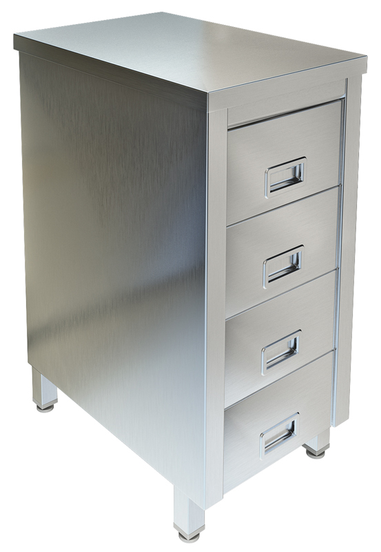 Корпус и четыре выдвижных ящика из нержавеющей стали марки AISI 304 толщиной 0,8мм.