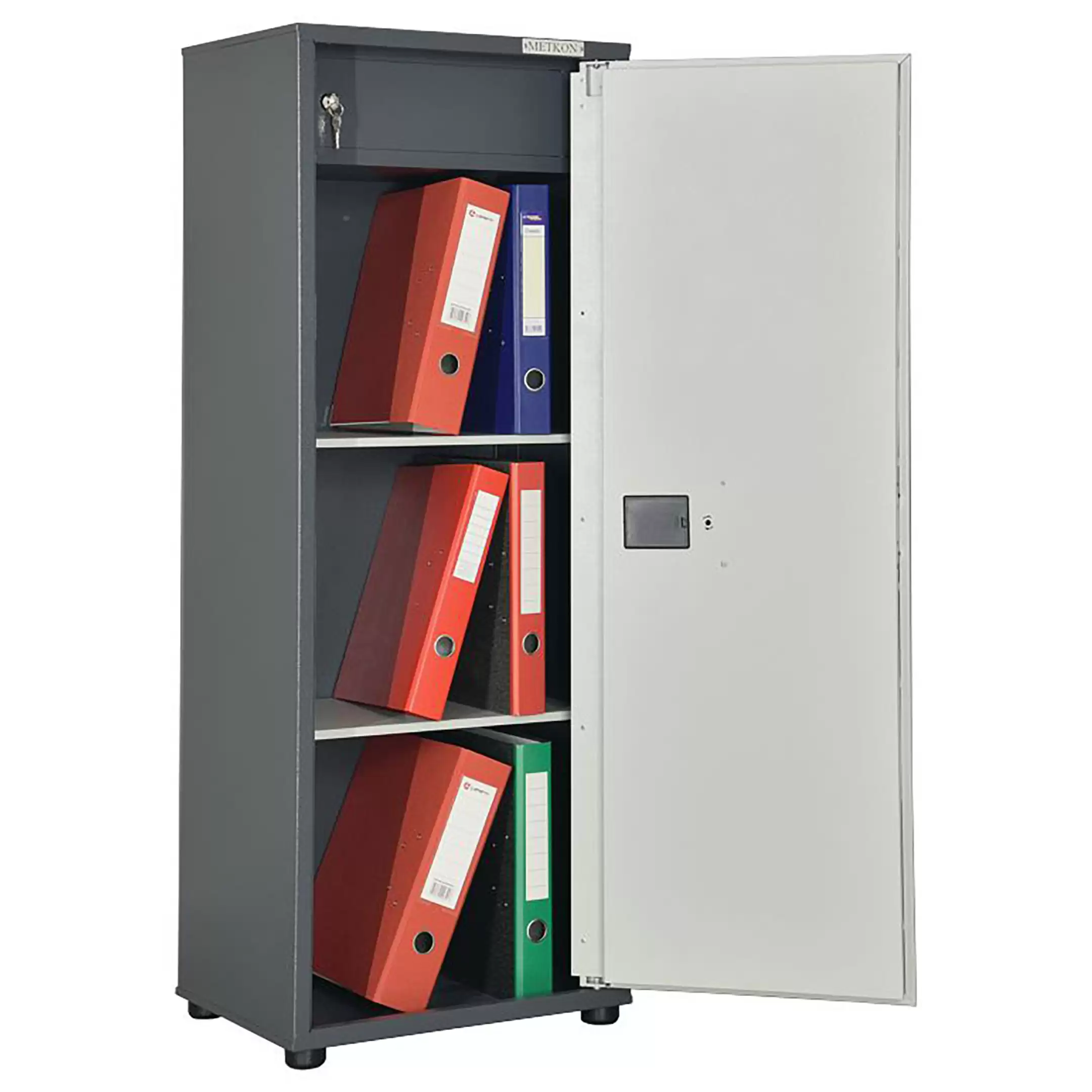 - Современная система электронной защиты — шкаф оснащен электронными замками на обеих створках, что обеспечивает повышенный уровень безопасности хранения конфиденциальных документов и ценных предметов. Управление доступом осуществляется с помощью кода или карты, исключая риск утери механических ключей.
