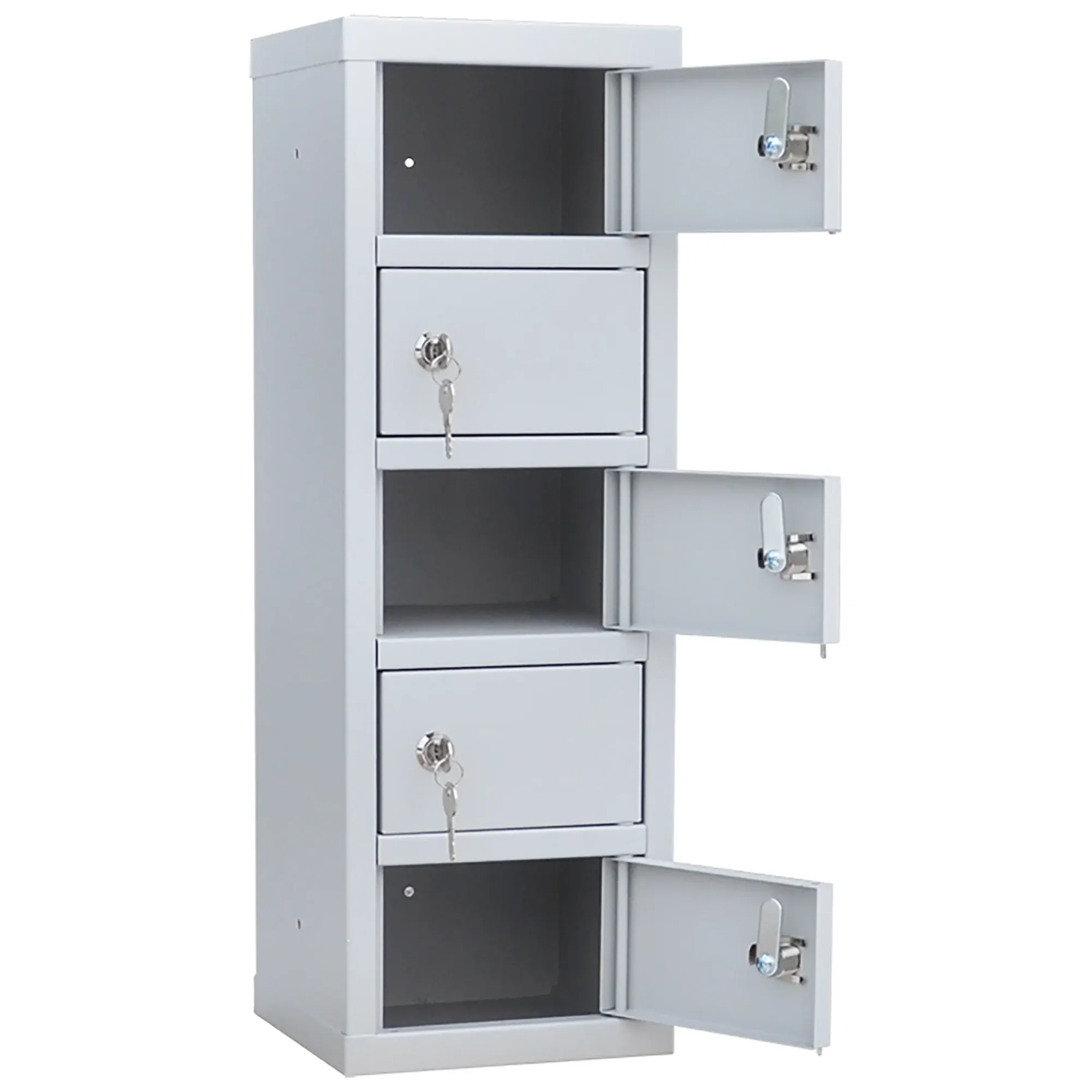 - Минималистичные размеры для размещения в любой точке — шкаф предоставляет 5 индивидуальных запирающихся ячеек в корпусе минимальных габаритов. Его можно установить непосредственно на рабочем столе, кассе, стойке администратора или в автомобиле, не занимая практически никакого полезного пространства.