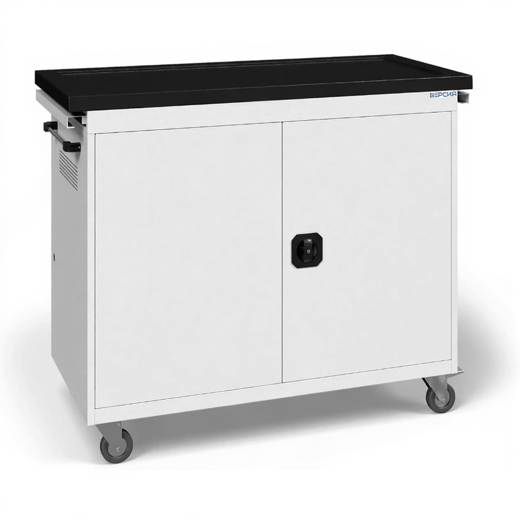 - Промышленная мобильность и управление — рассчитана на транспортировку значительного веса, оснащена прочными колесами. Централизованное управление через электросхему избавляет от необходимости отслеживать зарядку каждого устройства в отдельности.